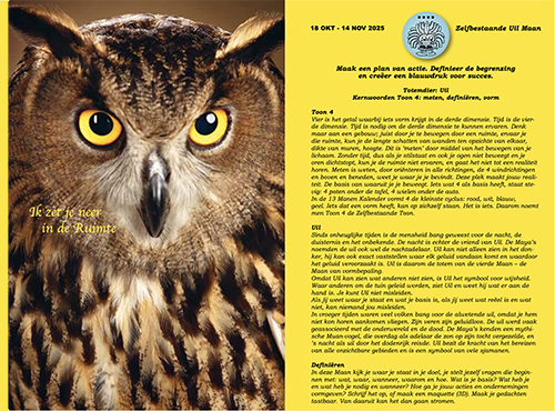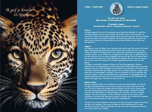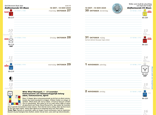 Elke nieuwe Maan een hele pagina met info over het totemdier en de Maanenergie, de Maan is herkenbaarder aanwezig op pagina door het golvende lijntje tussen de dagen.