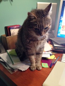 Welkom in het Storm Wavespell. We zitten er midden in. Storm geeft een heleboel energie welke ik nu gebruik om hard te werken en dingen helder te krijgen. Zoals je op de foto kunt zien maakt deze dame het me heel lastig om door te werken; ze loopt over het toetsenbord, voegt tekens toe die er niet horen, gaat boven op mijn handen zitten en erger blijft  over mijn stapel papieren heenlopen zodat alles door elkaar raakt. Hmmm. Zij is mijn Storm nu, die vraagt om aandacht en die me dwingt de stapel papier aan te pakken en op te ruimen!